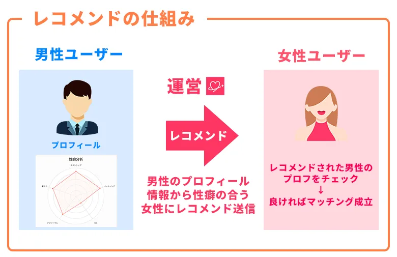 レコメンドとは記入したプロフィールを基に、運営が自動で性癖の会う相手にレコメンドを送ってくれる仕組み。